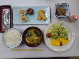 コンニャク牛蒡、しゅうまい、ハッシュドポテト、プレーンオムレツ、肉団子、ミックスサラダ、乳酸飲料、味噌汁、海苔、ご飯