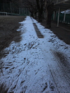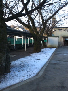今日は氷点下3度。校庭の桜の木の下の霜が、あられが積もったように凍っていました。