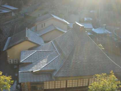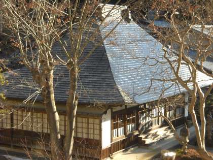 皎月院の北側屋根は凍りついていますが、朝日のあたる南側屋根は、一気に溶け始めていて様子が対照的です。