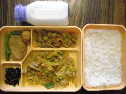 ごはん・ホイコーロー・根菜ごま和え・がんもの含め煮・わかめのにんにく炒め