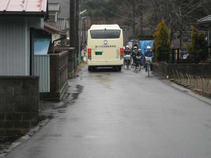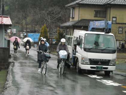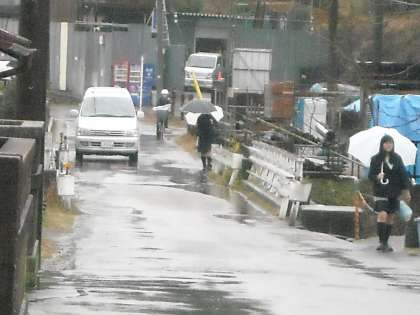 雨で視界が悪いので、いつも以上に車に注意する必要があります。