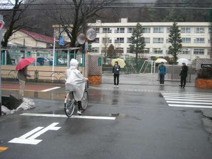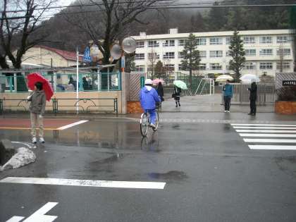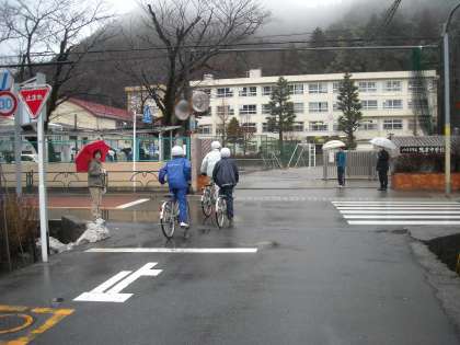 校門前の道の横断は、一時停止が必要です。