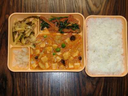 ごはん・白いんげん豆の甘煮・豆腐のエビチリソース炒め・