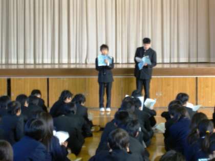実行委員が司会をして、引率責任者の副校長先生、学年主任の水谷先生の話や実行委員からの連絡・注意事項を聞いて、最終確認を行いました。