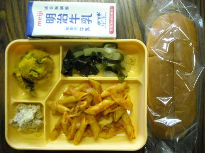 パン・ベーコントマトパスタ・海草サラダ・マッシュパンプキン・ツナディップ