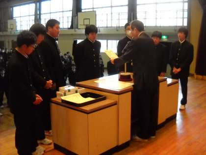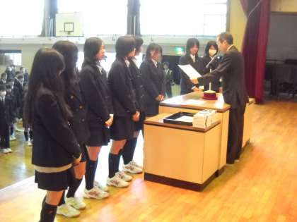 ソフトテニス部の、春休み中にあった試合の表彰がありました。