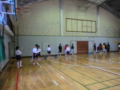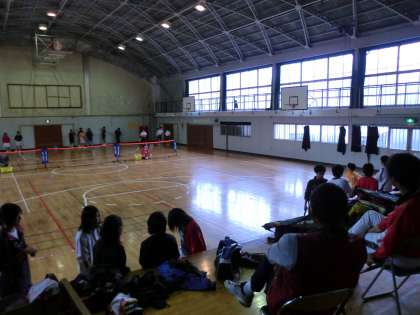 雨でグラウンドが使えないので、体育館で練習です。
