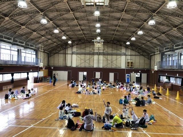 大谷緑地での自然体験を終え、小宮公園に向かう途中ぽつぽつ雨が落ちてきたので、大事を取って(小宮公園には屋根のある場所がないため)小宮公園でのお弁当を取りやめ、学校に戻り体育館でお弁当を食べました。みんなで輪になり仲良く食べました。