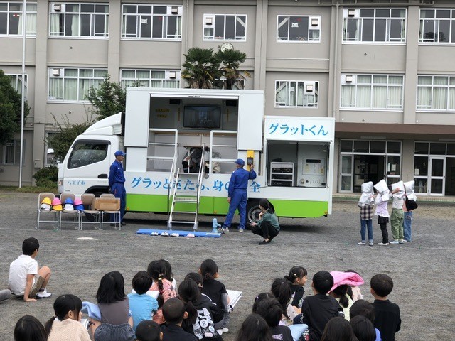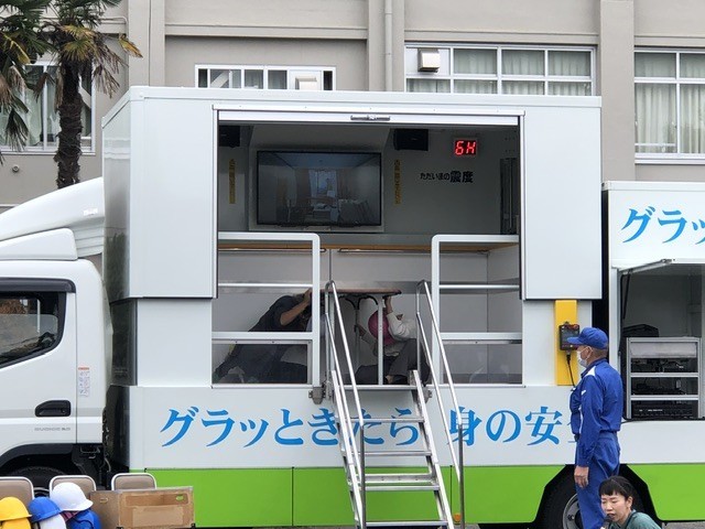 今日は地震による避難訓練を行いました。各クラス放送とともに「おかしも」の約束を守って上手に避難できました。その後起震車「グラットくん」にて、地震の揺れを擬似体験しました。