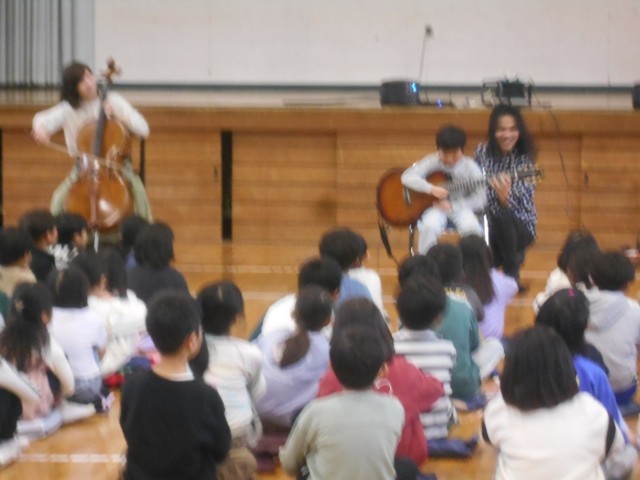 今日の5校時、学校コンサート「エバリー」の皆様に子供たちのよく知っている曲の演奏を楽しく披露していただきました。初めてギターを触る子の演奏体験もありました。最後に、皆で声を合わせて校歌を歌いました。