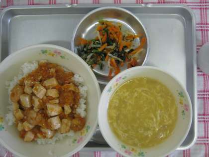 えびと豆腐のチリソース丼・コーンとたまごのスープ