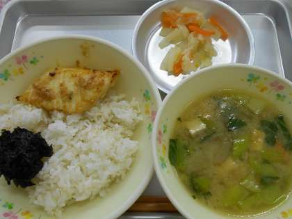 今日は現在の給食 『一汁三菜』の和食を中心とした献立です。