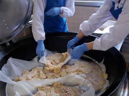 クラス配膳で、ごはんにかつをのせてから、みそダレをかけます。