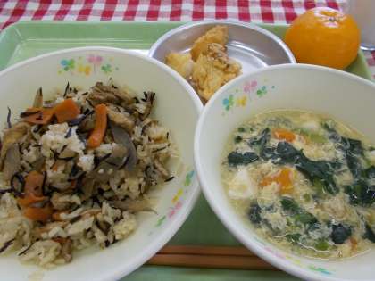 かやくごはんは、ひじきや油揚げ、しいたけ、野菜等、いろいろな具材が入っているので、とても楽しんで食べられます。
