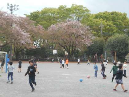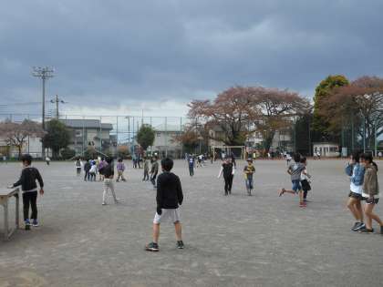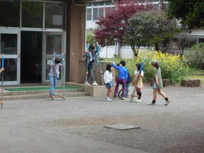 2年生以上の子供たちは外遊びです。雨はふっていないけど、風つよっ