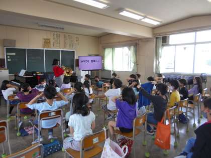 音楽の時間、ホルンの音を聴きました。大きい音にびっくり。