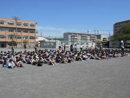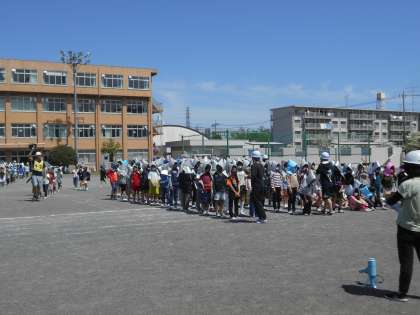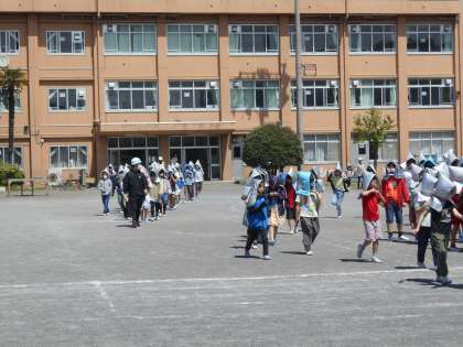 今日の訓練は火災想定でした。1年生にとっては初めての避難訓練です。全学年、とても静かに整然と非難できました。えらい!