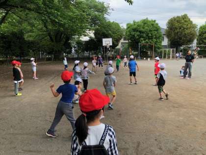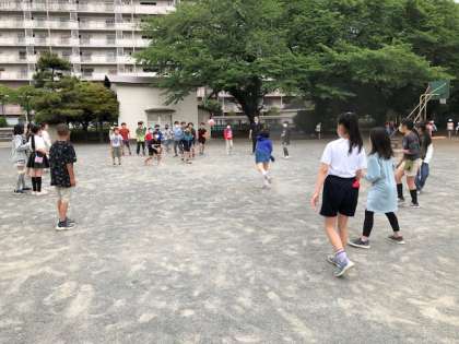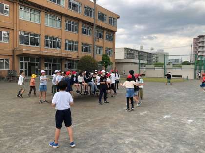 昼休み、たくさんの子供たちが校庭で遊んでいます。クラス遊びをしているクラスも多かったです。