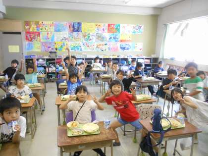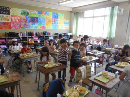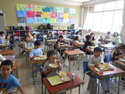 自分たちでむいたグリンピースごはんはおいしいね、2年生のみなさん。