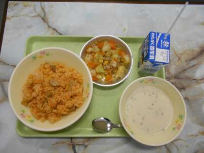 だいずピラフ、ジャガイモのポタージュ、カリカリじゃこサラダ。おいしい。