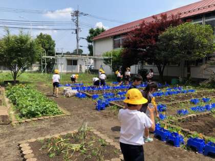 先生、芽が出たよ。1年生は朝顔の水やり。今日は暑いのか校庭はいつもより人出が少ないです。