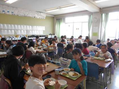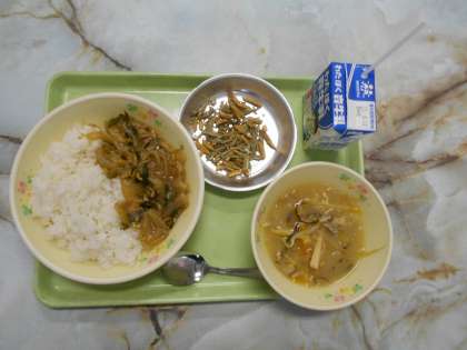 ぶたキムチごはん、中華スープ、ごまめナッツなり。おいしいね。画像は6年生。