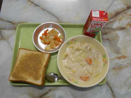セサミトースト、八王子産キャベツのクリーム煮、野菜のピクルス、リンゴジュース。セサミトーストがまたうまし。お昼の放送は読み聞かせやクイズがありました。