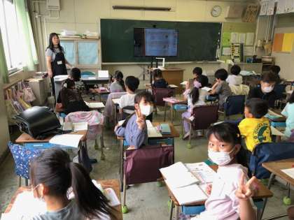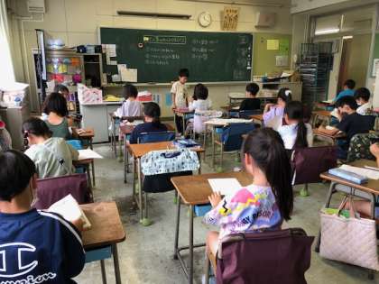 2年生は算数の勉強をしていました。教室に入るといつもピースで迎えてくれます。