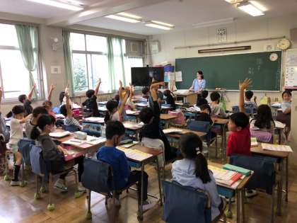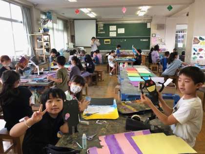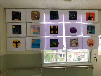 3年生は図工と国語の勉強。みんなよく手が挙がっていました。図工室前には6年生の作品がありました。