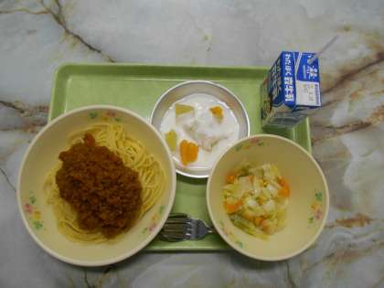 今日はスパゲティミートソース、コールスロー、フルーツヨーグルトです。人気給食メニューの上位に位置するスパゲティミートソースはやっぱりうまし。コールスローサラダはキャベツの千切りやみじん切りを使ったサラダのことです。バスケットボールはフリースロー