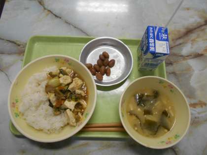 豆腐のうま煮どん、具だくさんみそ汁、金時豆の甘煮。「具だくさん」というワードには本能的にヨワイ・・・