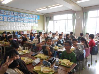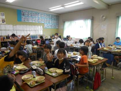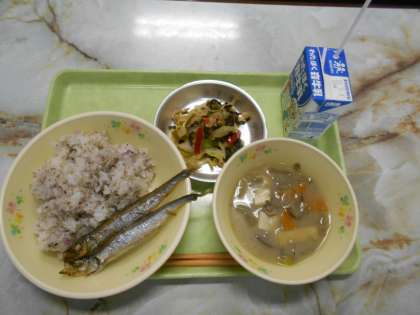 ゆかりとじゃこのごはん、やきししゃも、とんじる、やさい炒め。うまいのう、ししゃもの顔はこわいのう。5年生のみんな。