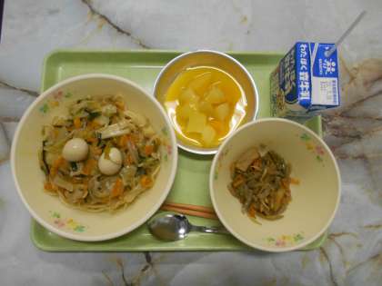 今日は長崎県の郷土料理です。皿うどん、浦上そぼろ、フルーツのミカンソースです。