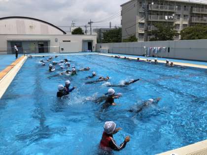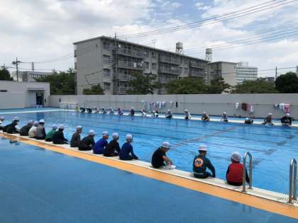 3年生はプールで着衣泳です。初めての体験で、服を着て水に入ることの大変さを勉強しました。