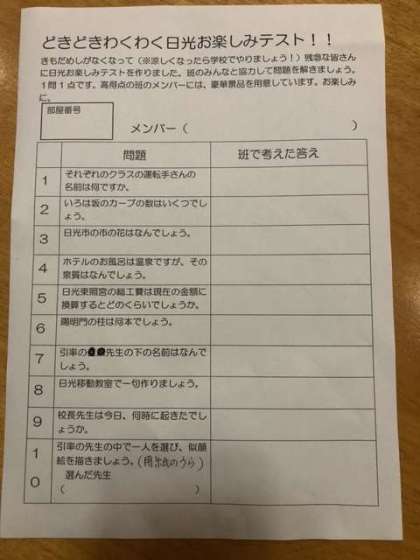 ナイトハイクの代わりに、部屋ごと対抗のどきどきわくわく日光お楽しみテスト!!が行われました。おもしろかった。