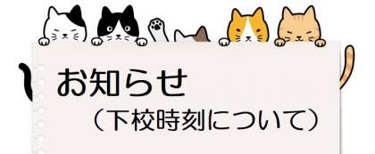1年生は最終下校時刻13:30、2・3年生は最終下校時刻14:40、4年生以上は最終下校時刻15:30となります。下校の際は、教職員で通学路の見守りをいたしますが、保護者の皆さまでも可能な方は見守りのご協力をよろしくお願いいたします。