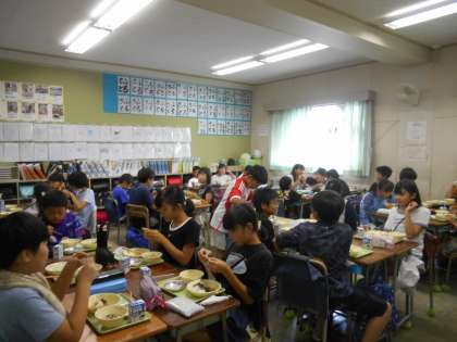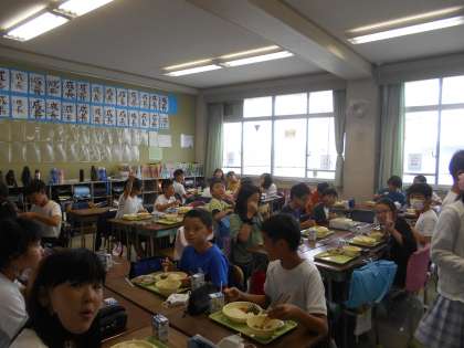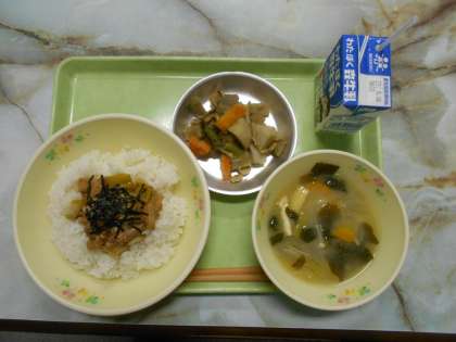 やきとりどん、さといものうま煮、たまねぎのみそ汁。うましうまぞう5年生
