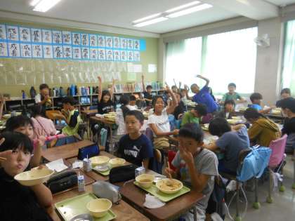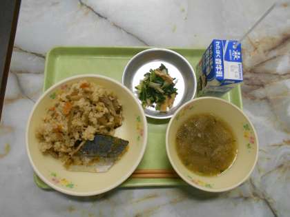 かやくごはん、さわらのみそ漬け、ごんぼじる、こまつなのたいたん。今日は大阪府由来のこんだてです。かやくごはんは、ごぼうや油揚げ、肉などの具材を加えて炊きこんだご飯のことです。おいしいね、5年生