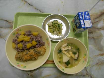 秋月ごはん、石垣揚げ、ゆかり和え、八王汁。くりものってて豪華なり。