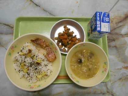 さつまいもごはん、赤魚の香味焼き、五目煮豆、きのこ汁なり。
