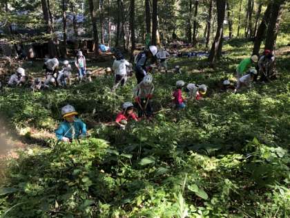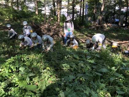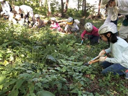 下草刈り。森を守り育てるために大切な作業です。手が痛いよ、と言いながらがんばりました。