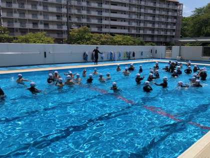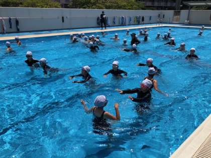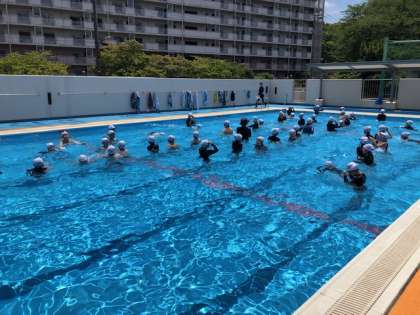 4年生。今年初めてのプールの学習です。プールでの約束を確認した後、水慣れで鬼ごっこです。水の中を走るのは難しいです。