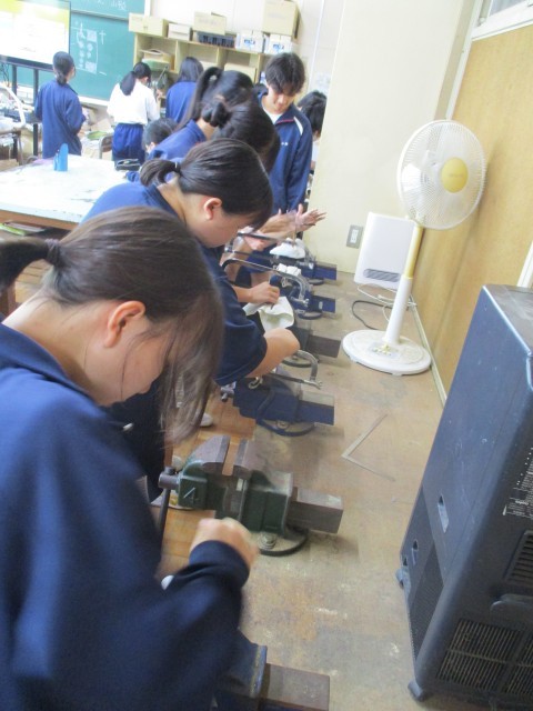 3年生の技術の時間では、金工の作業を行っています。専用の道具を使って集中して作業に取り組んでいる姿が見られました。
