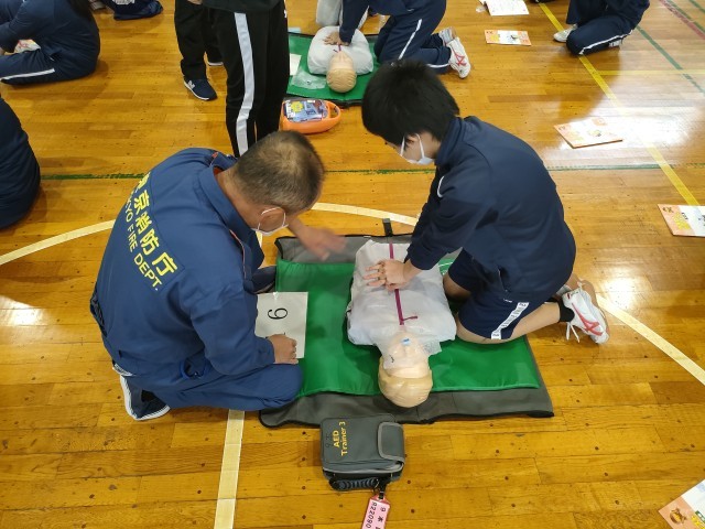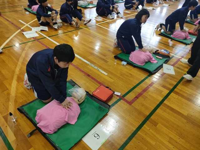 本日は、八王子消防署、東京防災協会の方々に来ていただき、本校の体育館で救命救急講習を行っていただきました。講習を受けた2年生は、皆大変集中して講習に臨むことができ、最後には、講師の方からもお褒めの言葉をいただきました。