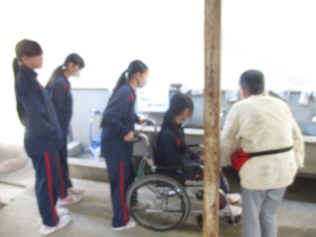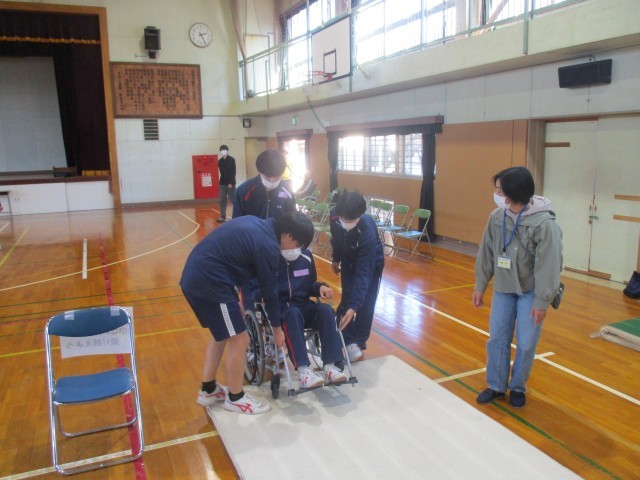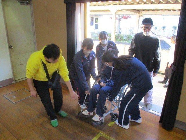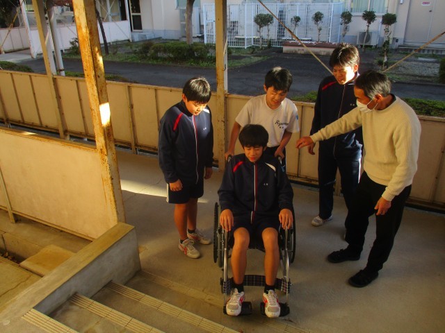 午後の5,6時間目には2年生と7組の生徒が、福祉体験として「車いす」の扱い方を体験しました。