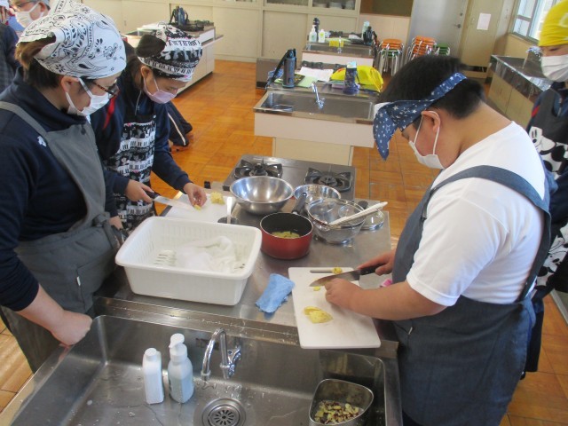 7組は家庭科の調理実習で「スィートポテト」を作っています。丁寧に包丁を使い、班で協力しながら作っています。