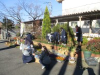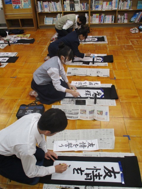 書写の授業です。今日は図書室を使って書初めの練習です。