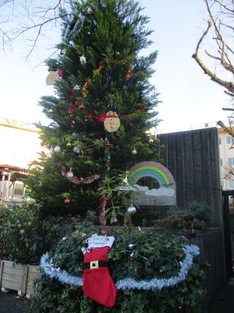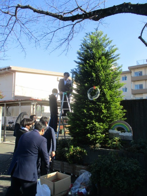 今日はいつもの活動に加えて、学校の正門にある木を飾り付け、クリスマスツリーにしました。