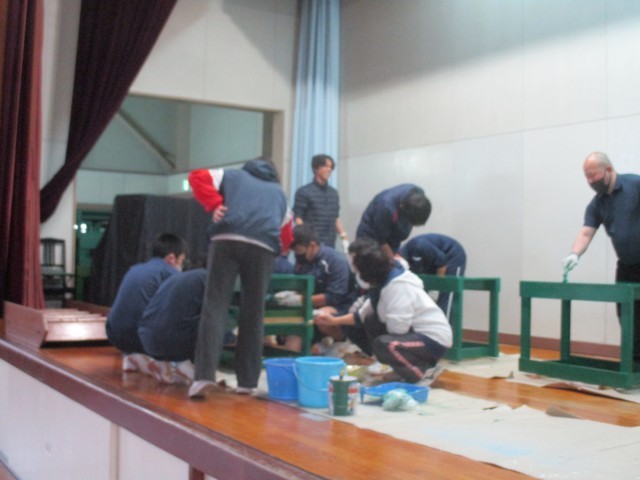 7組の3年生が、卒業に向けての取り組みで、体育館のひな壇をきれいに塗りなおしてくれています。