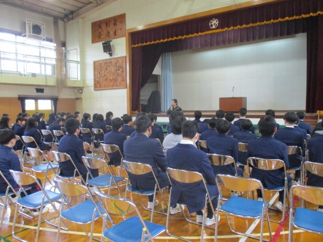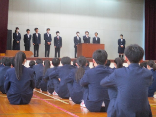 生徒会朝礼では各委員長が今年度のまとめを話しました。